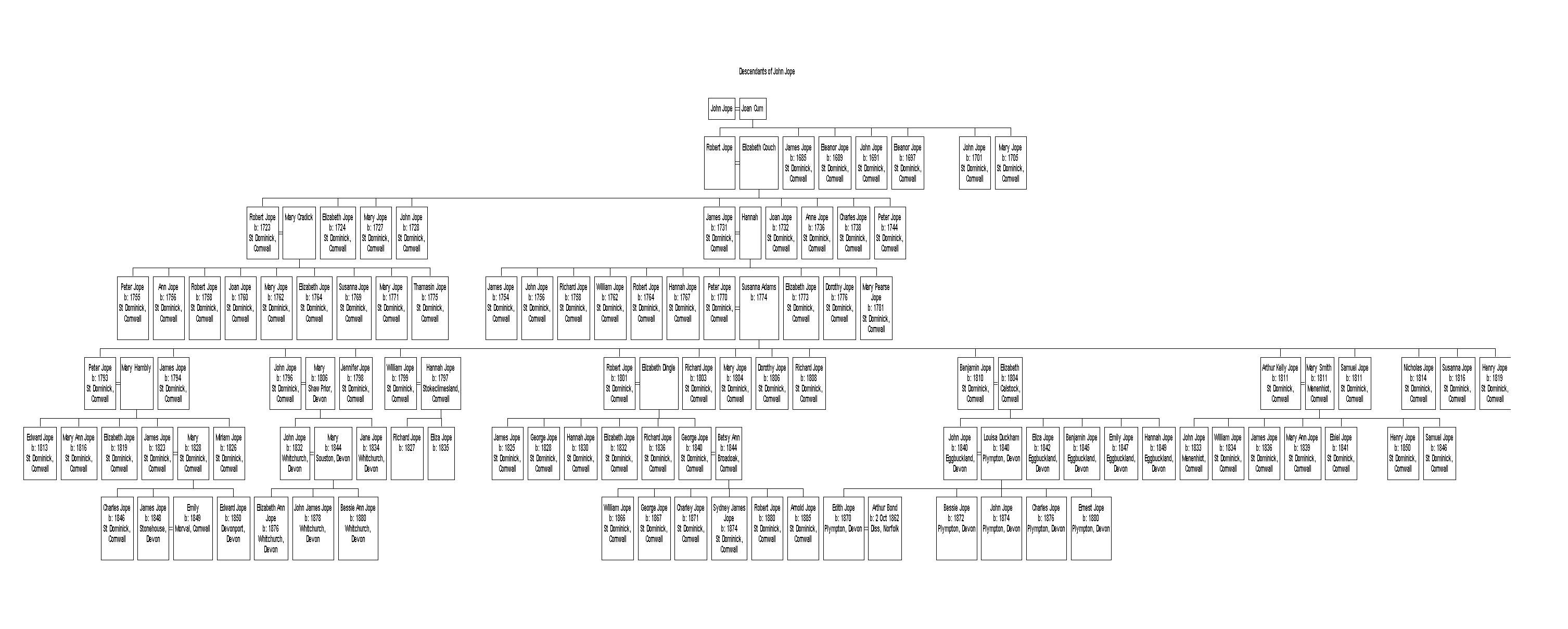 11. JOHN6 JOPE (PETER5, JAMES4, ROBERT3, JOHN2, GEORGE1) was born 1796 in St Dominick, Cornwall. He married MARY STEVENS. She was born 1806 in Shaw Prior, Devon.